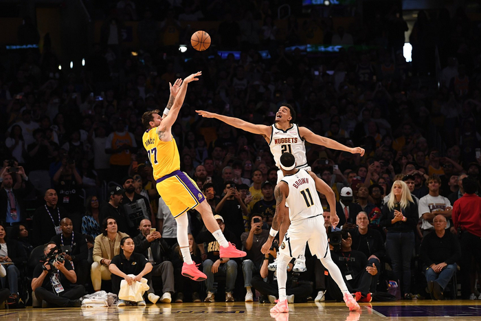 东契奇单打手感火热,招牌撤步三分连续单吃约翰逊和布劳恩换防;掘金试过用约老师去对位斯玛特,湖人继续用东契奇+斯玛特挡拆反制——只要斯玛特能投进外弹三分,湖人就能让约老师在防挡拆中付出代价。